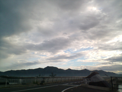 そうして早起きして出かけ、待ち合わせの友人と合流して広島へドライブ。写真は家から出発してすぐ、家の傍を流れる川に掛かる橋を渡ろうかというところ。そもそも出雲は「八雲立つ」と枕詞の指すように、その名の由来は「雲の出る国」ということでもともと雲の多い土地なのですが、今日は朝からまた一段と雲の多い日でした。台風が沖縄から北上している所為もあるのかもしれません。天気予報では曇りや晴れでしたが、流石に島根と広島の県境にある中国山脈を越える峠では雨が降ったり止んだりと、不安定な様子でした。