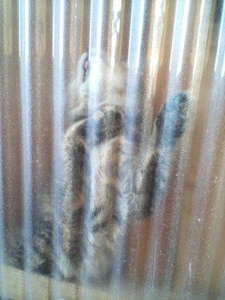 関係ありませんがこの写真は今日、うちに来た猫。我が家の猫のエサを奪っていたので弟が威嚇したら、慌てて逃げて、トタンと板の隙間に入り込んでしまったらしいのです。