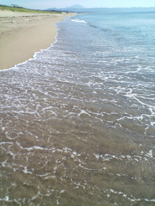 五枚目は波打ち際。波が寄せて引く、その場所が目的地です。ここに地元で「波の子」と呼んでいる貝がとれるのです。波が来て砂が緩んだ瞬間に、砂の中に足を潜らせて、もぞもぞすると、足に硬いものが当たるわけです。それを手でとるのもよし。波が引いた瞬間、それに引かれて一緒に流れていく貝を掴まえるのもよし。