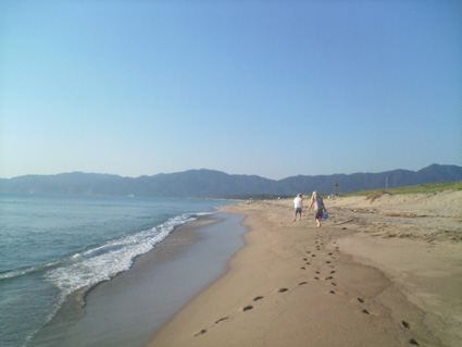二枚目の写真は砂浜。子供のころはこの倍はありました。子供目線だから、ということではなく、テトラなど波を防ぐ策が講じられていないので、年々砂浜が短くなってきているのです。遠くに見える高い山は三瓶山。